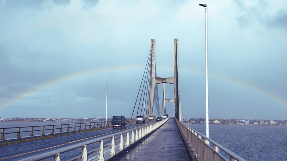 年明けに銚子大橋を往復しました。橋を渡った茨城県の波崎の街を見て、帰りの橋の上でにわか雨に降られたのですが、後ろを振り返りビックリ。なんと空に虹がかかっていたんです。そして、今年も良い年になるだろう、と確信をして銚子の街に戻りました。