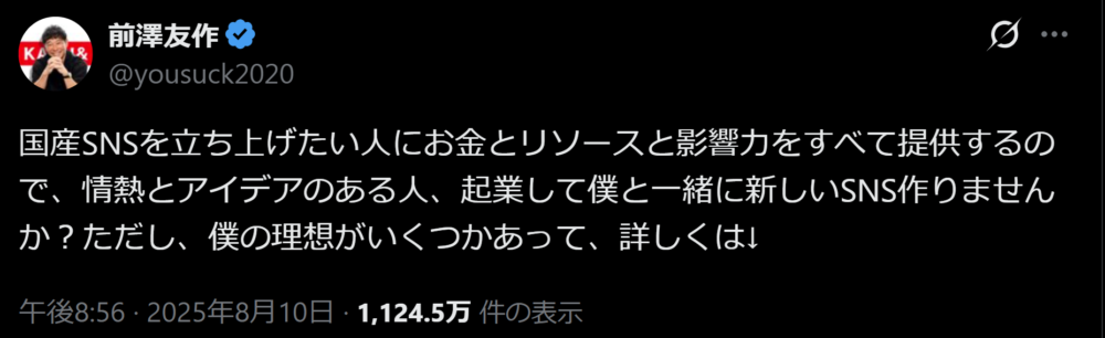 ZOZO創業者の前澤勇作さんも、SNSの立ち上げに興味を示しているひとりです。本人確認により、詐欺、虚偽の広告、誹謗中傷、デマ、差別を許さない、健全な国産コミュニケーション基盤の必要性を訴えています。この話が出たのは参院選と重なり、彼も言論統制への不信感を抱いているんだな、と感じたと共に希望を抱きました。